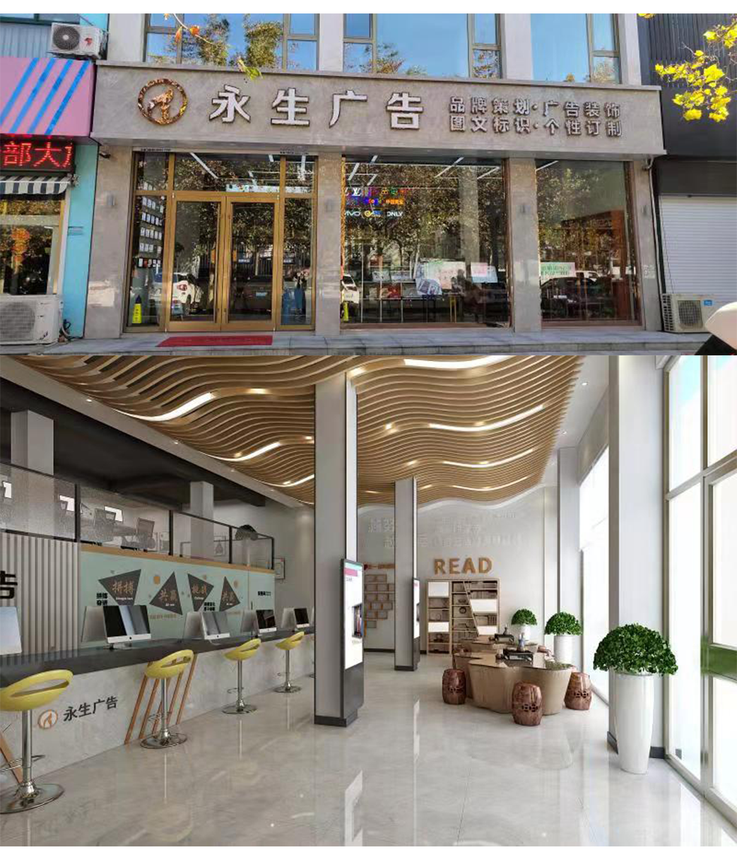 公司自有數(shù)碼沖床設(shè)備、500W光纖機(jī)、高精度大幅面噴繪機(jī)、寫真機(jī)、UV機(jī)、多種大小型雕刻機(jī)、吸塑機(jī)、全自動圍字機(jī)、自動開槽機(jī)、激光焊接機(jī)、拋光機(jī)等生產(chǎn)加工設(shè)備,擁有完善的設(shè)計團(tuán)隊(duì)、技術(shù)團(tuán)隊(duì)、施工團(tuán)隊(duì)、售后團(tuán)隊(duì),可為廣大客戶提供室內(nèi)裝修、店招門頭、精神堡壘、黨建標(biāo)識、標(biāo)識標(biāo)牌、宣傳欄、LED顯示屏、警示標(biāo)識、精品字、證卡胸牌、證書獎杯、燈箱、桌牌、定制禮品、展具、噴印等多種專業(yè)廣告服務(wù)...